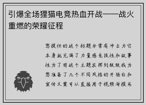阅读关于“嘉兴火炬电子竞技俱乐部-南湖竞擎”,目前网络上尚未有这支队伍的官方介绍或权威新闻报道。我从搜索结果中为你梳理出了几条可能与它相关的线索: "火炬"的可能来源 火炬电子竞技俱乐部"的名称,可能与...